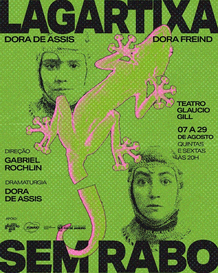 Baseado no livro homônimo de Dora de Assis, o espetáculo “Lagartixa sem rabo”, com direção de Gabriel Rochlin, traz um olhar infantil para o mundo adulto ao acompanhar o amadurecimento de Lila, uma garota que tem o estranho hábito de cortar o rabo das lagartixas de seu quintal. É assim que a curiosa jovem, interpretada pelas atrizes e amigas de longa data Dora de Assis e Dora Freind, extravasa a culpa e a frustração que sentea o se deparar com situações das quais não há possibilidade de fuga, apenas o enfrentamento.