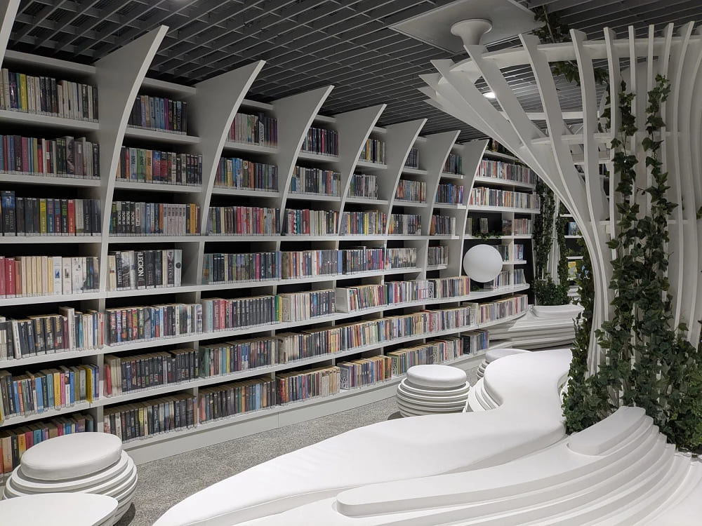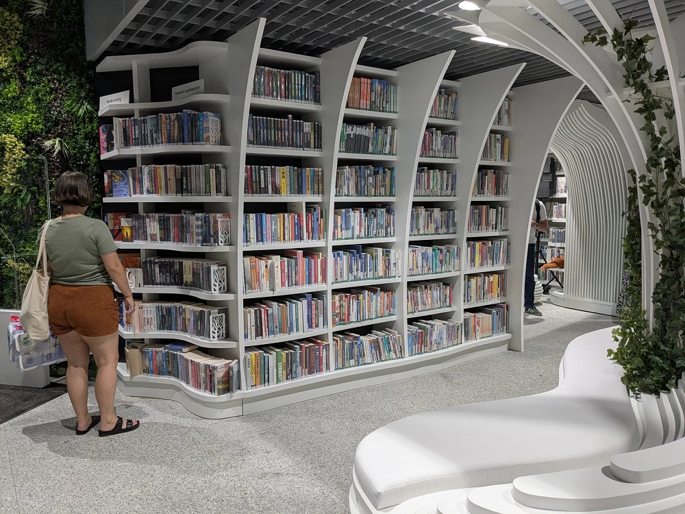 Com um sistema de autoatendimento para empréstimo e devolução, incluindo uma máquina de livros automática que funciona 24 horas, os passageiros podem usufruir do espaço e escolher sua próxima leitura.