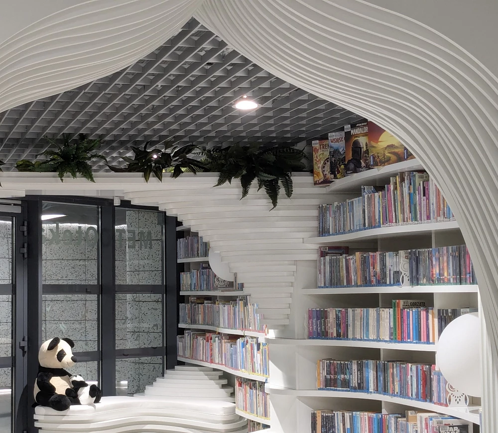 Localizada na estação de Kondratowicza, no bairro de Targówek, a biblioteca conta com 150 metros quadrados, divididos entre áreas para crianças e adultos, e um acervo de 16 mil livros de diversos gêneros literários, além de computadores portáteis e um ambiente para relaxamento.