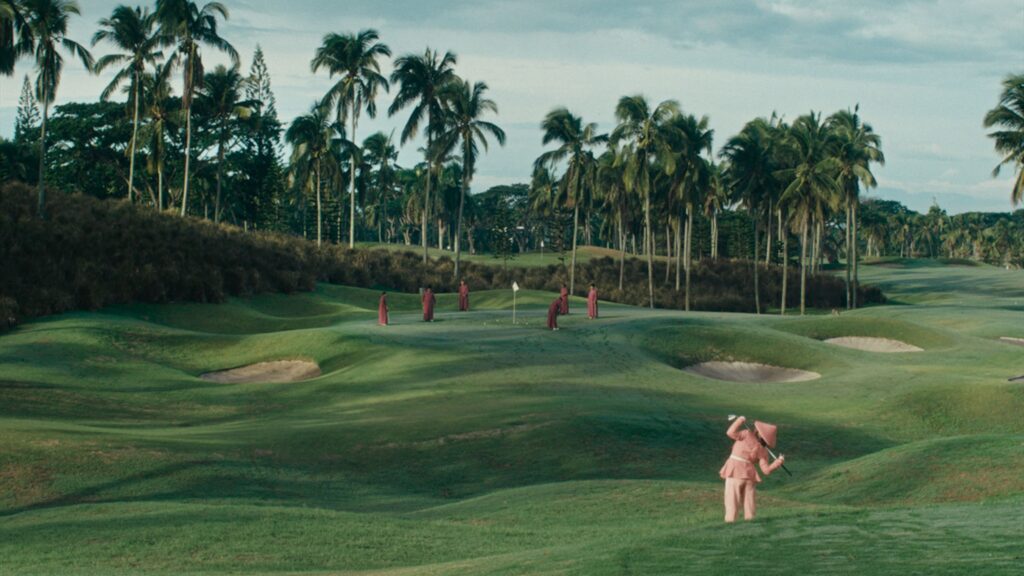 Essa rigidez das formas se estende para as pessoas que ali habitam. Há uma hierarquia bem definida ali. “Somente os jogadores e os caddies podem estar no campo” relembra uma gerente para suas funcionárias, e até o modo que os jogadores se dispõem em dado momento é ordenado, sincronizado, e sempre reforça a ordem das coisas. A protagonista, Isabel (Jorrybel Agoto), fica agachada próxima ao jogador, substituindo as bolas, enquanto ele fica acima dela. O diretor Rafael Manuel a enquadra entre as pernas do golfista.